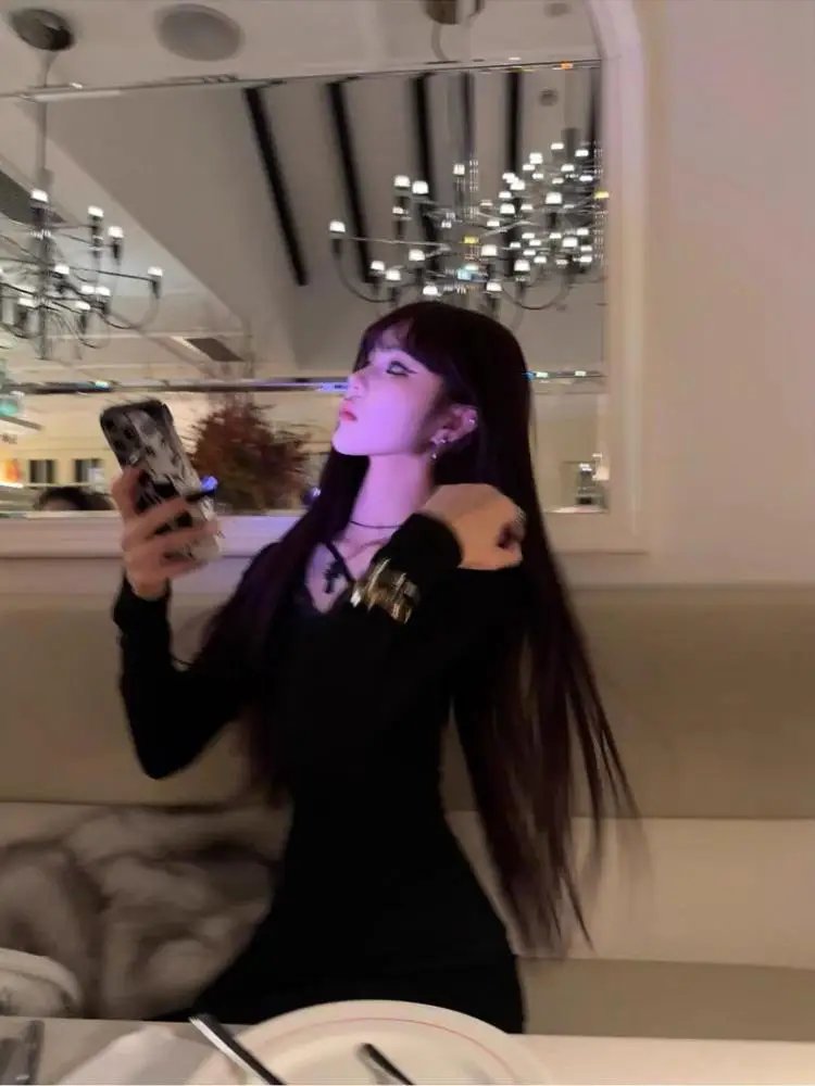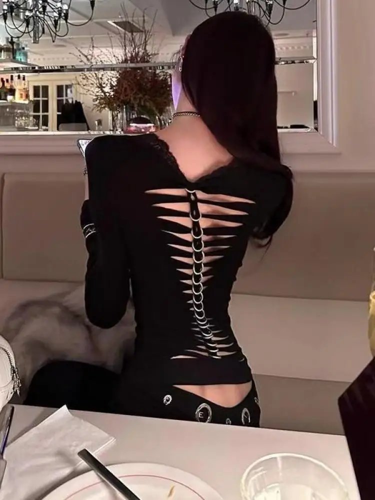 • Black Y2K Goth Hollow Out T-Shirt Women